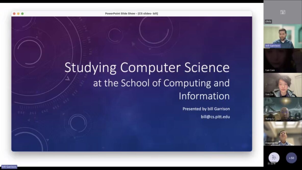 CS and IS seminar was held on March 6, 2024, from 19:00 to 20:00 (GMT+8) China Standard Time. The seminar invited Dr. Bill Garrison, Teaching Assistant Professor and Assistant Dean for Academic Programs, School of Computing and Information (SCI), and Dr. Daqing He, Full Professor at the Department of Informatics and Networked Systems (DINS), SCI. The seminar began with a brief introduction, followed by Dr. Garrison introducing the relevant information of the major CS, including major details, course requirements, and practical opportunities provided. Then, Dr. He introduced the relevant information of the major IS. Finally, Dr. Garrison and Dr. He answered the questions about curriculum study for students.