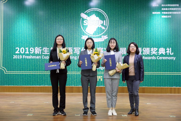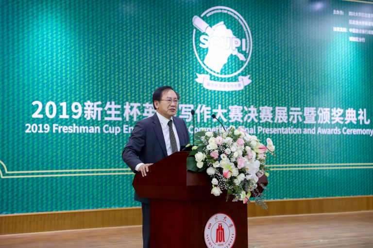 On December 14, 2019 Sichuan University (SCU) Vice President Bin LIANG, leaders from the Construction Bank of China’s Chengdu branch, representatives from over ten Sichuan University colleges, leaderships of the Sichuan University-Pittsburgh Institute (SCUPI), students and other guests gathered at Sichuan University’s Jiang’an Campus Institute for Disaster Management and Reconstruction to witness the final round of the SCU Freshman Cup English Essay Competition, sponsored by the Construction Bank of China. Judges for this year’s event included award winning writer and journalist, Leslie Chang, former reporter and anchor for CNN and NBC, Farland Chang, and Clemson University professor, Dr. Matthew Boyer. VP Bin LIANG opened the event with a speech on the importance of writing in today’s world.