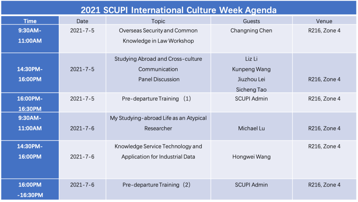 SCUPI International Culture Week is aimed to share and impart legal and safety knowledge, etiquette and communication traditions, advanced studies and job search experience to students who are going to study abroad through a series of seminars, lectures, and workshops. The 2021 SCUPI International Culture Week will be held from July 5th to 6th. All students who are about to participate in the 2+2, 3+1 joint education program are required to participate, and other students voluntarily sign up. For the convenience of the students who cannot be present, this event is also synchronized online through Tencent Meeting.