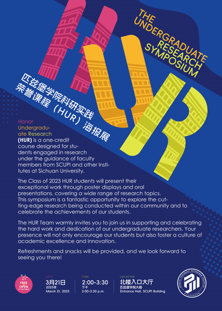 Honor Undergraduate Research (HUR) is a one-credit course designed for students engaged in research under the guidance of faculty members from SCUPI and other Institutes at Sichuan University.