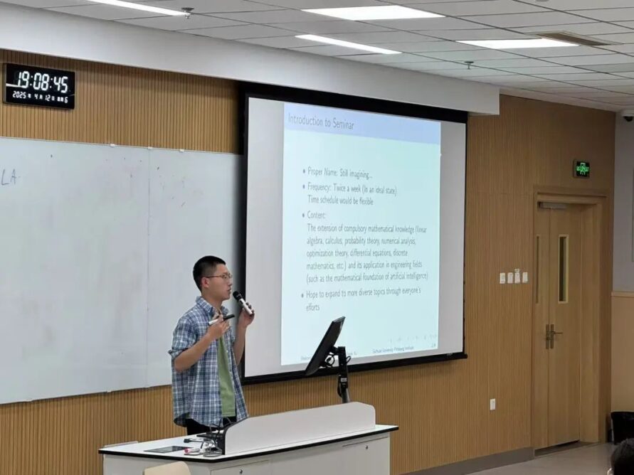 This semester, the Class Council of Sichuan University – Pittsburgh Institute (SCUPI) organized two mathematics seminars, showcasing the unique appeal of interdisciplinary collaboration and highlighting the universal nature of mathematical language. Breaking away from the traditional lecture-style format, where teachers instruct and students passively listen, these seminars adopted an innovative approach: students independently explored specialized mathematical topics and then invited interested students and teachers to engage in collaborative discussions. This method not only deepened participants’ understanding but also inspired collective academic exploration. Through open discussions, book sharing, and other engaging formats, the seminars reinforced professional knowledge, cultivated an environment of intellectual passion, and attracted over 150 participants. These events have laid the foundation for an academic exchange platform. Below is a recap of the highlights from the two mathematics seminars.