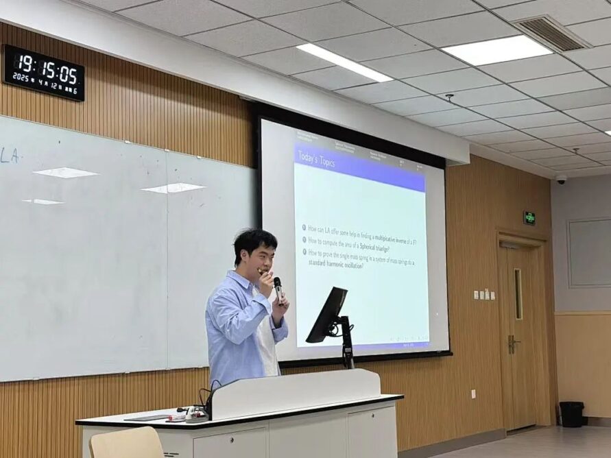 Chaojia Yu, who majored in Computer Science from the Class of 2026, hosted the seminar and introduced the goals of the Mathematics Seminar. Yuchen Wang, who majored in Industrial Engineering from the Class of 2027, began with simple questions that gradually evolved into complex explorations, guiding attendees through abstract algebra, calculations of spherical triangle areas, and modeling analyses of multi-oscillator harmonic vibration systems.