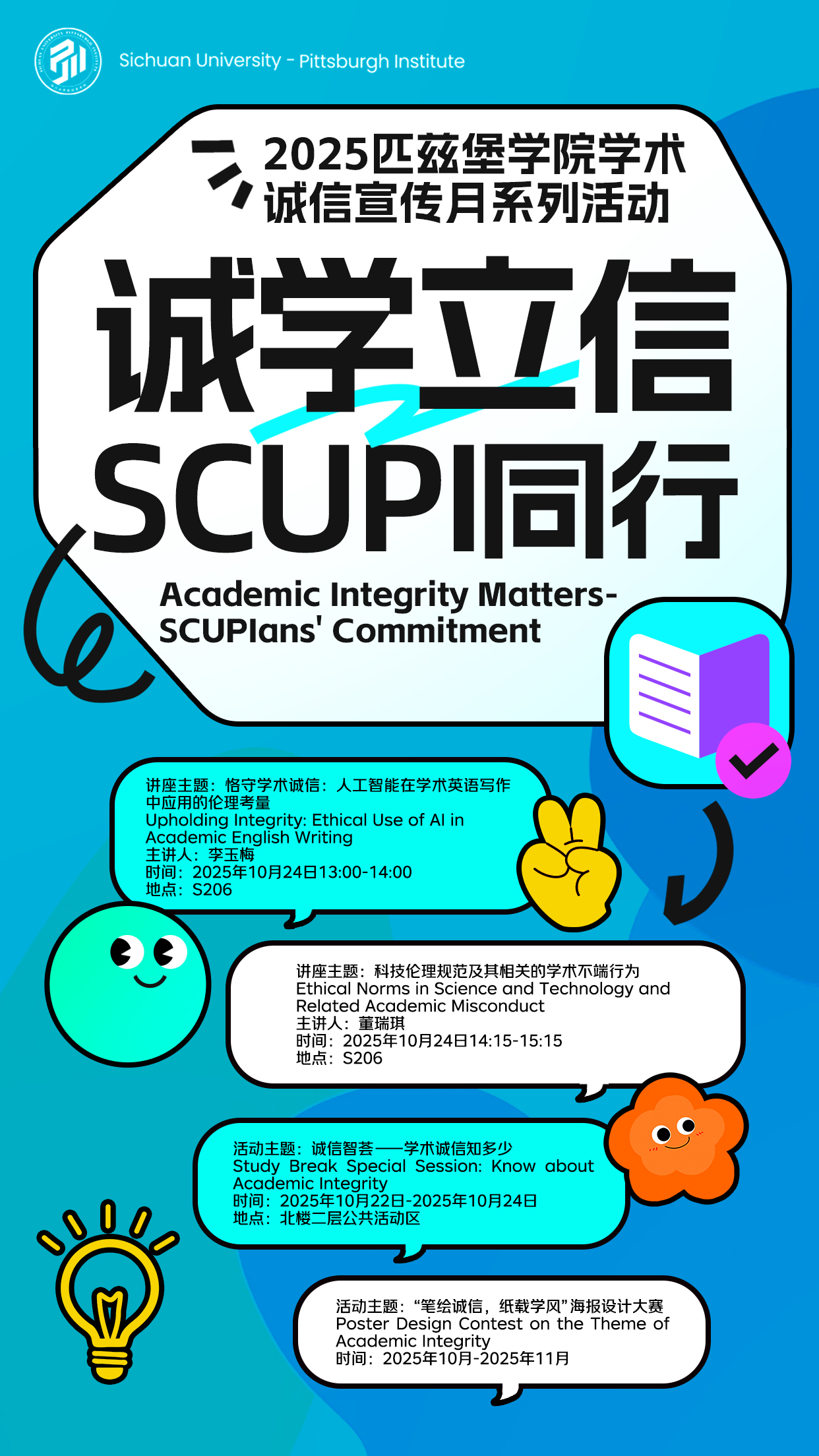 To enhance the understanding of academic ethics and foster a culture of integrity among students, SCUPI is committed to establishing an equitable academic atmosphere. Our goal is to nurture a generation of talents with global vision and social responsibility. In pursuit of these objectives, SCUPI will organize a series of events, aiming at promoting academic integrity. The specifics of these initiatives are outlined below.