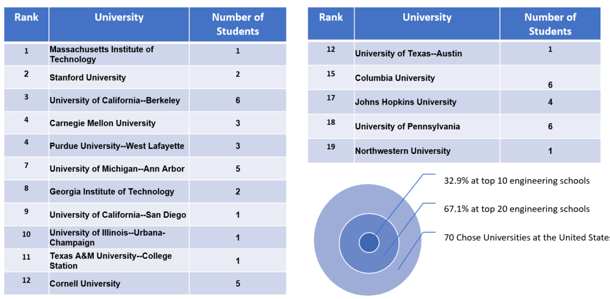 - 47 or 67.1% of graduates who chose to pursue graduate study at American Universities enter top 20 engineering graduate schools (U.S. News, 2022 Best 20 Engineering Schools), including 23 or 32.9% at top 10 graduate schools.