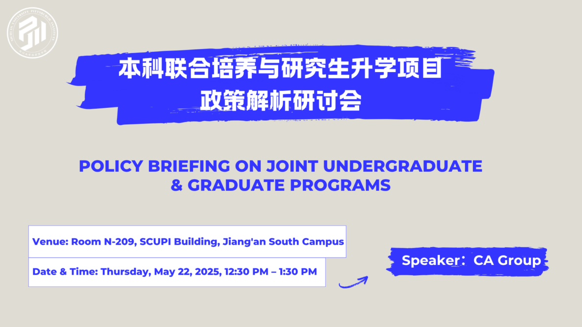 This seminar will focus on the policy framework behind SCUPI’s international undergraduate and graduate study pathways. It aims to help faculty better understand the structure, key requirements, and ongoing developments of joint programs. As these pathways expand, the faculty’s role in curriculum delivery, academic advising, and student support becomes increasingly important.
