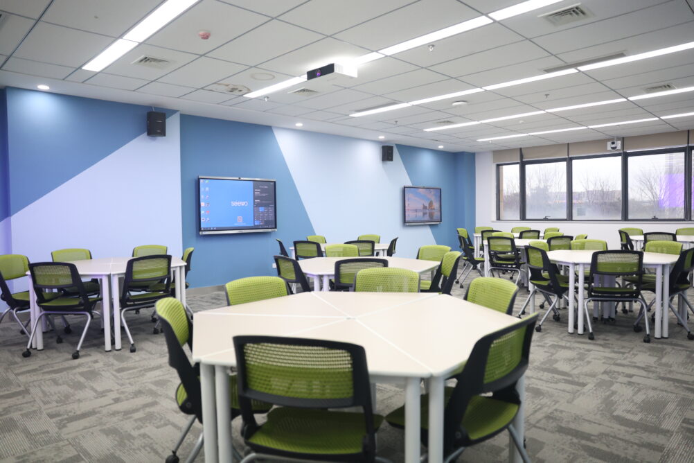 “Four screens on the two sides of the classroom walls are great so that no matter where the students sit in the classroom, they can see the slides. I also like the circular seating layout so that I can walk around the classroom in multiple lines,” Prof. Ruiqi Dong expressed her satisfaction with the multi-screen classrooms.